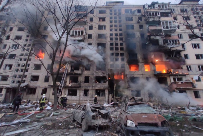 Bombeiros tentam apagar incêndio em prédio atingido por bombardeios no distrito de Obolon, em KievAFP PHOTO / STATE EMERGENCY SERVICE OF UKRAINE / HANDOUT