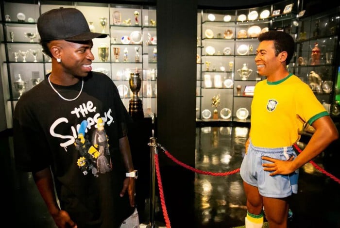 "Feliz de estar aqui, vim conversar um pouco com o Professor e conhecer também a estátua do nosso Rei, que não tinha visto ainda. É muito parecido. Não pode ficar olhando muito, senão ele vai acabar se mexendo", brincou Vinícius Júnior à 'CBF TV'.