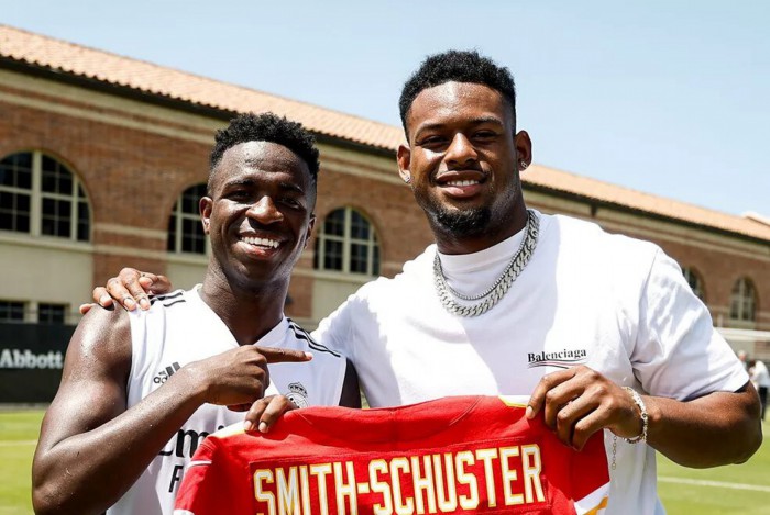 Vinícius Júnior bate bola com JuJu Smith-SchusterFoto: Divulgação/Real Madrid