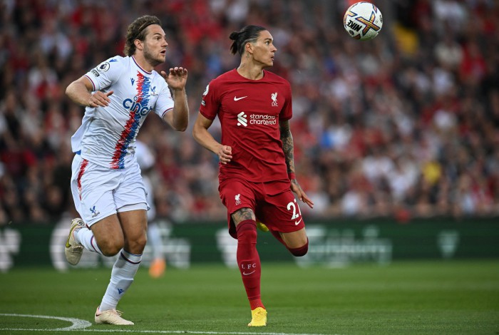 Andersen e Darwin Núñez em disputa de bola entre Liverpool e Crystal PalacePAUL ELLIS / AFP