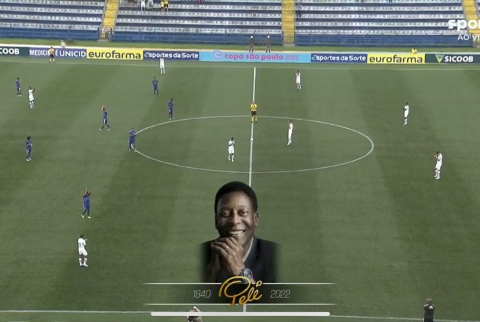 Em tempo: a partida está no segundo tempo, e o Santos vai vencendo a partida por 2 a 0. Autores dos gols do jogo até aqui, Deivid e Fernandinho comemoraram com o soco e o salto no ar, em homenagem a Pelé.Homenagens ao Rei Pelé na estreia dos #MeninosDaVila: será a primeira vez que o Peixão ostentará a coroa acima do escudo do #MantoSagrado. E, além do minuto de silêncio antes do pontapé inicial, o jogo será interrompido aos 10min do 1º tempo para que todos possam aplaudir o Rei. pic.twitter.com/8NNYfU6OfX
