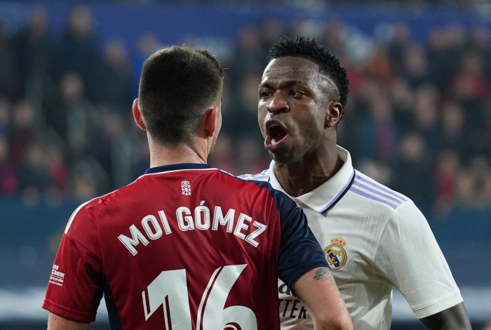 O atacante Vinícius Júnior foi novamente alvo de insultos de torcedores rivais no Campeonato Espanhol. O brasileiro, de 22 anos, foi xingado por torcedores do Osasuna, neste último sábado (18), no Estádio Al Sadar, pela 22ª rodada. O Real Madrid venceu por 2 a 0 e o camisa 20 teve dois gols anulados.