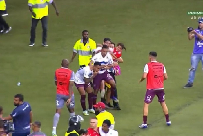 Momento em que um torcedor do Internacional invade o campo com uma criança de colo para agredir um jogador do Caixas Foto: Reprodução/Premiere