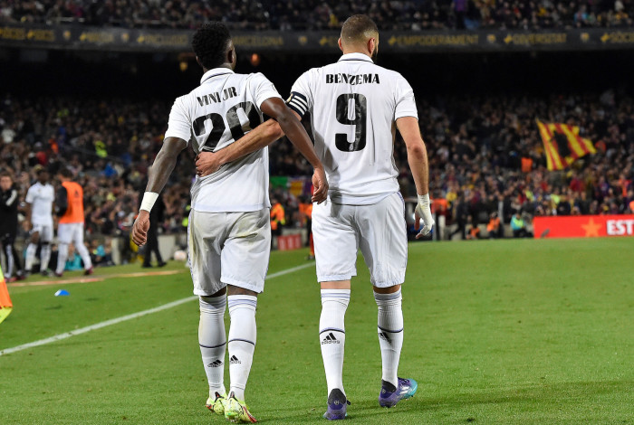 Já na segunda etapa, Benzema acabou com quaisquer chances de reação do Barça. Aos quatro minutos, Modric avançou pela direita e passou para o francês, que, na entrada da área, ajeitou o corpo e bateu rasteiro no canto direito. Nove minutos mais tarde, Vini sofreu pênalti e o centroavante converteu com autoridade, cobrando forte no meio do gol.