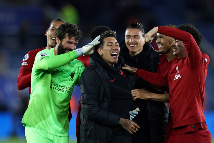 Roberto Firmino foi muito festejado pelos companheiros do Liverpool após o último jogo em AnfieldDarren Staples / AFP