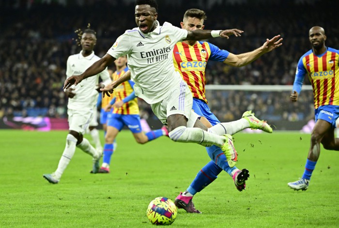 Gabriel Paulista dá entrada violenta em Vini Jr. na derrota do Valencia para o Real Madrid, em fevereiroJavier Soriano / AFP