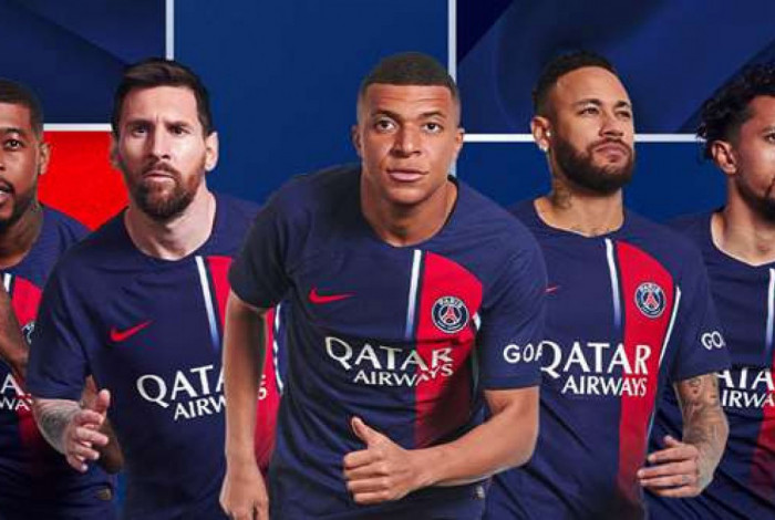 Mesmo em baixa e sem permanência garantida na próxima temporada, Neymar e Messi foram incluídos na campanha de apresentação da nova camisa do PSG. Os dois aparecem, ao lado de Mbappé, Marquinhos e Kimpembe, na foto de divulgação do uniforme principal para a temporada 2023/24.