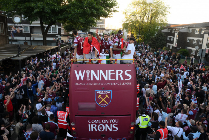 O West Ham parou as ruas de Londres nesta quinta-feira (8) para comemorar o título da Liga Conferência com seus torcedores. Em desfile em carro aberto, os jogadores celebraram a inédita conquista junto com milhares de fãs.