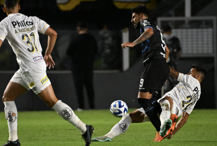 Disputa de bola entre Gastón Rodríguez, do Blooming, e Camacho, do SantosFoto: NELSON ALMEIDA / AFP