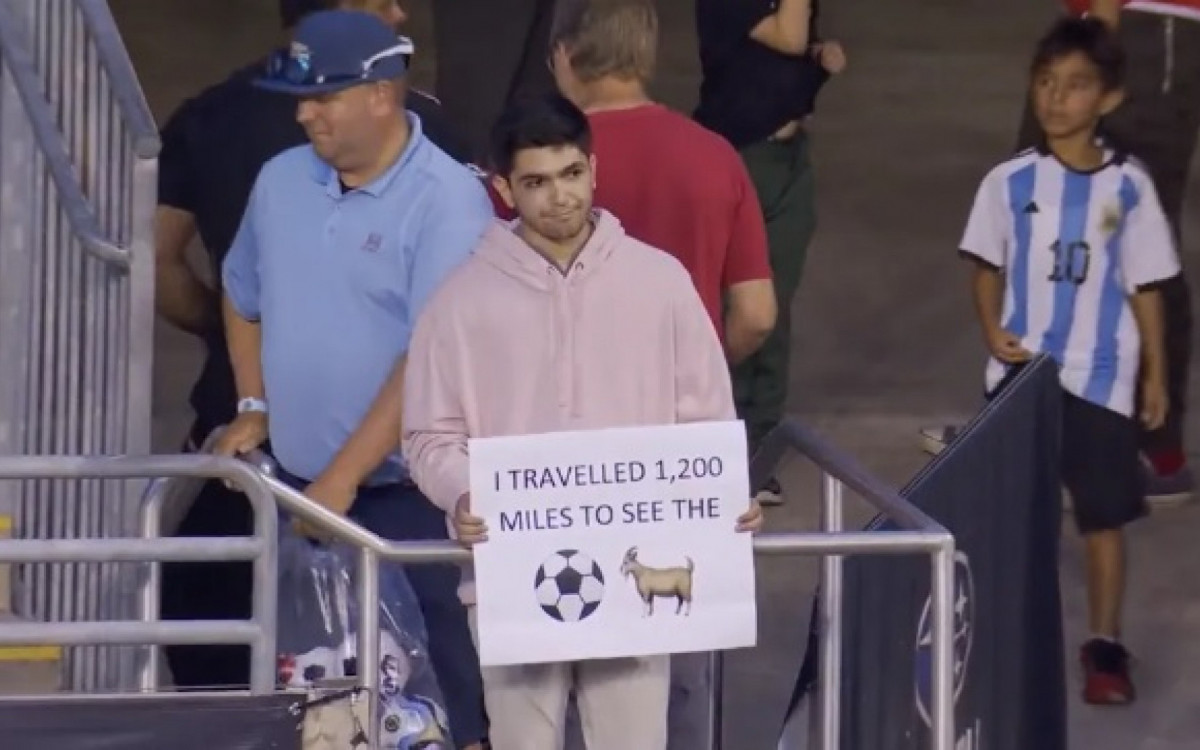 "Viajei 1.200 milhas (1931km) para ver o goat (traduzido do inglês como "o melhor de todos os tempos", representado por uma cabra ao lado de uma bola de futebol)", disse o torcedor, em uma clara referência a Messi.