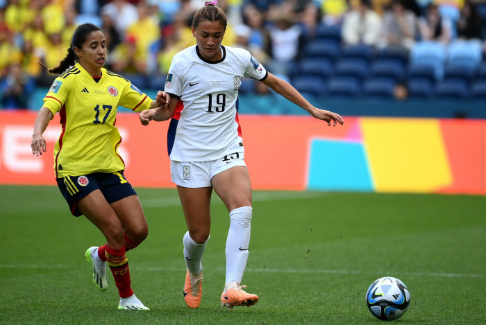 Carolina Arias marca Casey Phair durante o jogo entre Colômbia e Coreia do Sul Foto: FRANCK FIFE / AFP