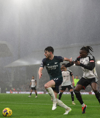 Declan Rice, do Arsenal, disputando jogada com Calvin Bassey, do FulhamAdrian Dennis/AFP