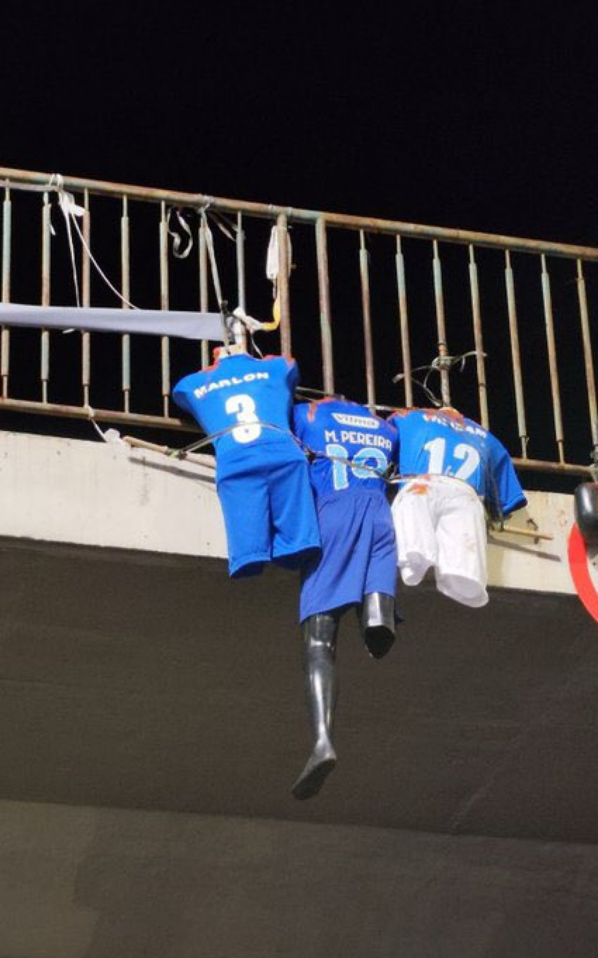 As imagens que circulam nas redes sociais mostram três bonecos vestidos com camisas que levam o nome dos jogadores. Eles estão sem cabeça e com outros membros do corpo espalhados.