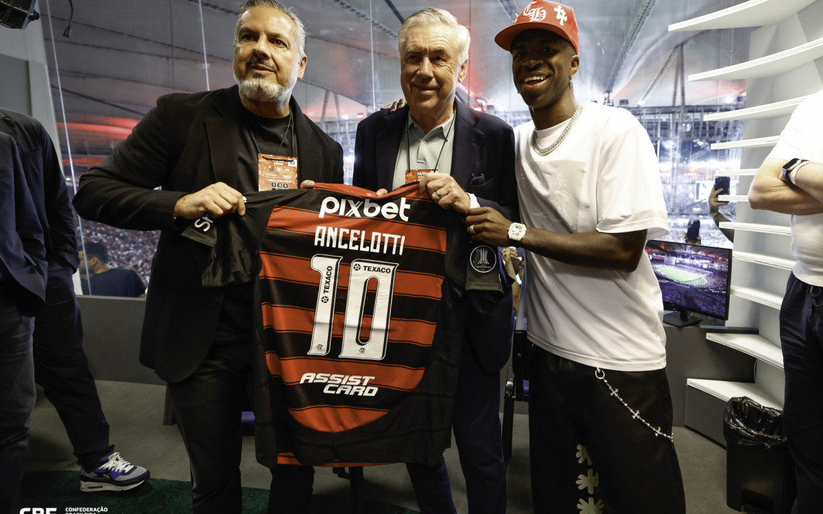 Ancelotti e Vini Jr ao lado de José Boto, dirigente do FlamengoRafael Ribeiro / CBF