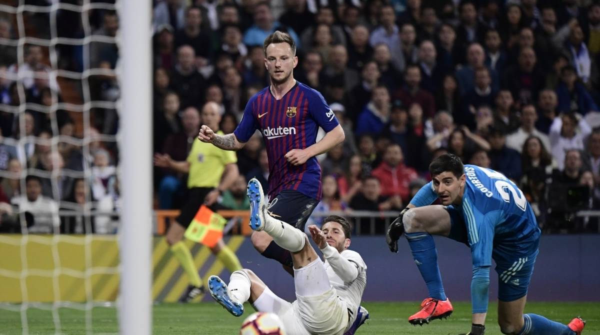 Barcelona's Croatian midfielder Ivan Rakitic (C) scores a goal past Real Madrid's Spanish defender Sergio Ramos (bottom) and Real Madrid's Belgian goalkeeper Thibaut Courtois (R) during the Spanish league football match between Real Madrid CF and FC Barcelona at the Santiago Bernabeu stadium in Madrid on March 2, 2019. (Photo by JAVIER SORIANO / AFP)JAVIER SORIANO / AFP