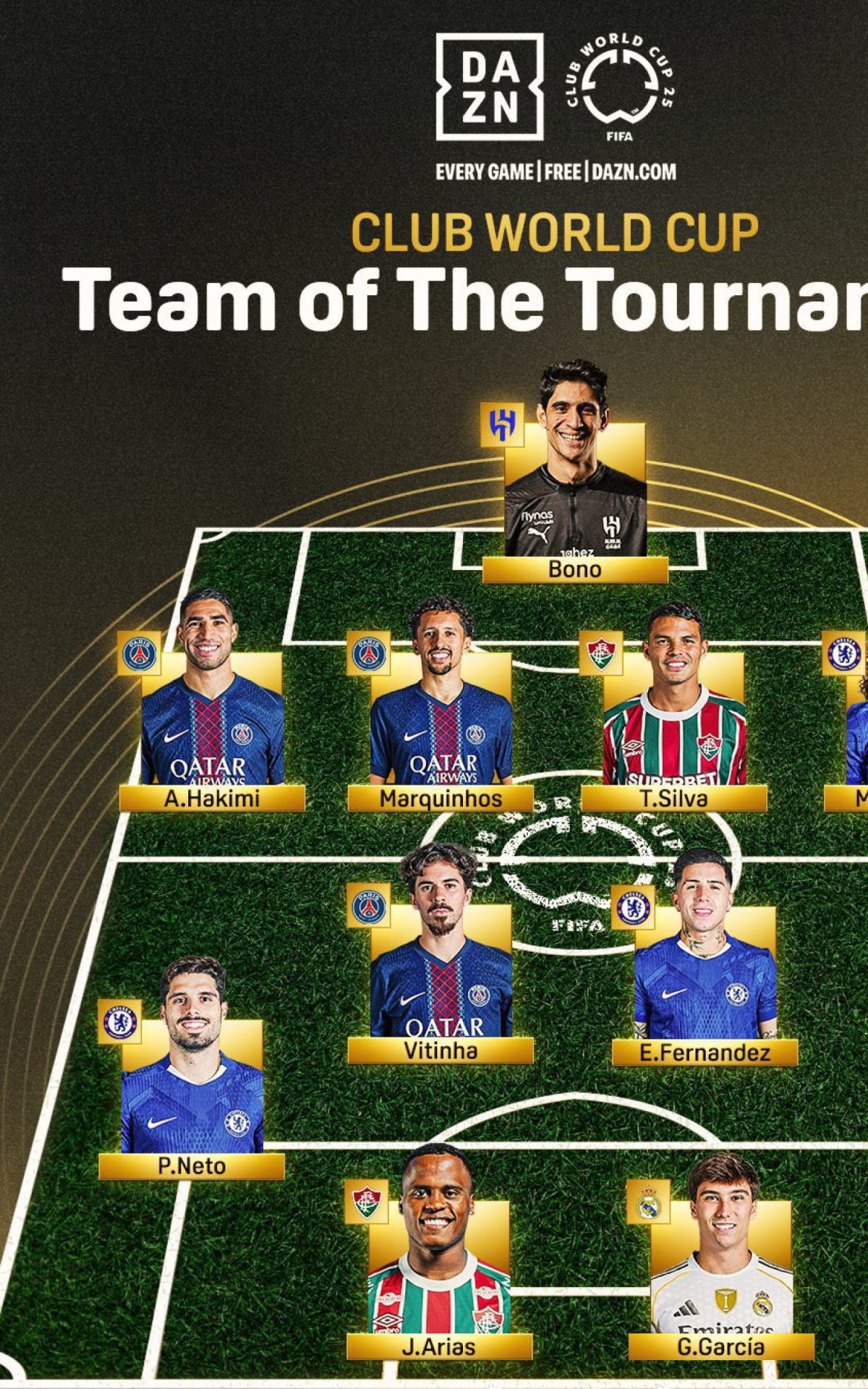 Finalistas do torneio, o Chelsea e o PSG dominaram a equipe. Os londrinos levaram quatro jogadores (Cucurella, Enzo Fernández, Pedro Neto e Palmer, que foi eleito o craque da competição). O PSG teve três (Marquinhos, Hakimi e Vitinha).
