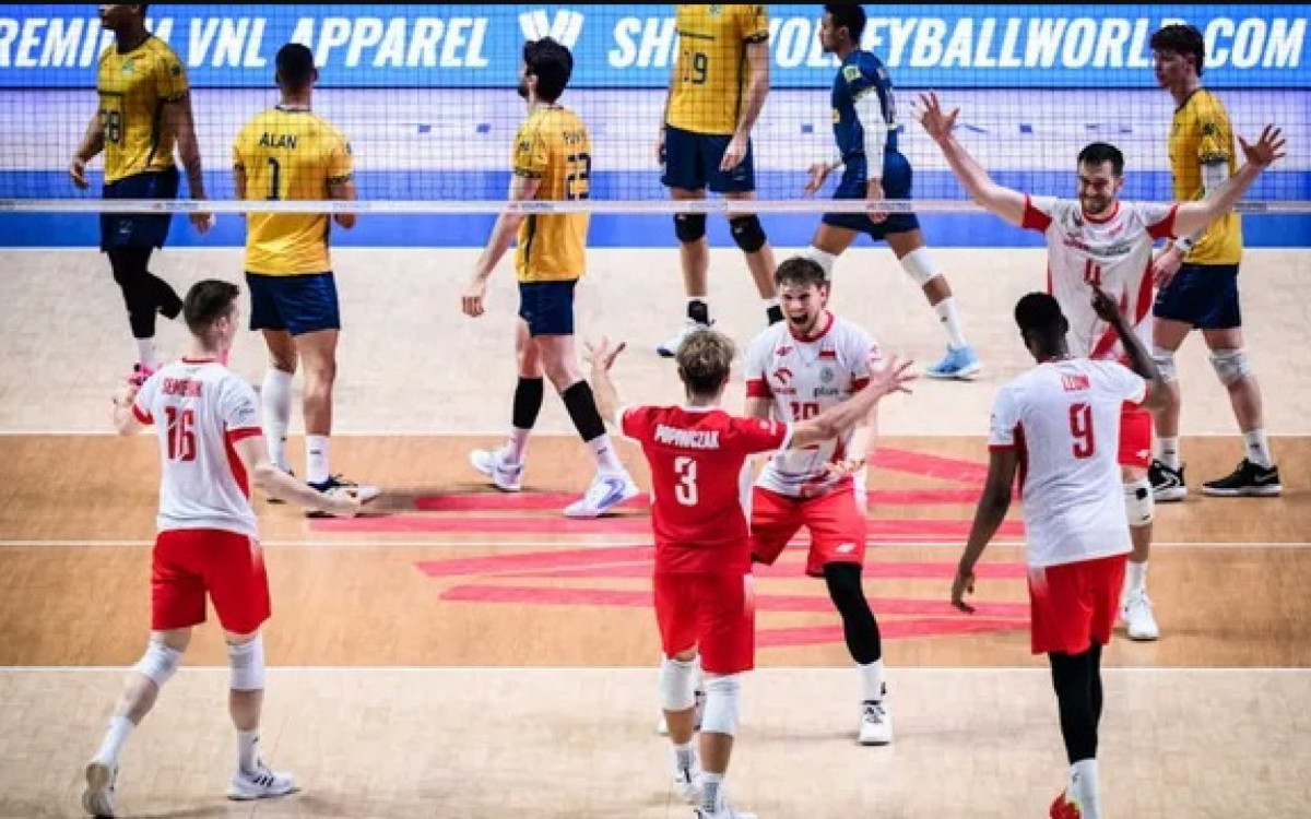 Líder da primeira fase da Liga das Nações de vôlei, com 11 vitórias e uma derrota, o Brasil não resistiu ao forte ataque da Polônia, líder do ranking mundial, e teve sua boa sequência interrompida na semifinal da competição, neste sábado, em Ningbo, na China. Os europeus levaram a melhor por 3 sets a 0, parciais de 28/26, 25/19 e 25/21, com atuação impecável do oposto Sasak, e buscarão, neste domingo, seu segundo troféu no torneio - os brasileiros também venceram uma vez.