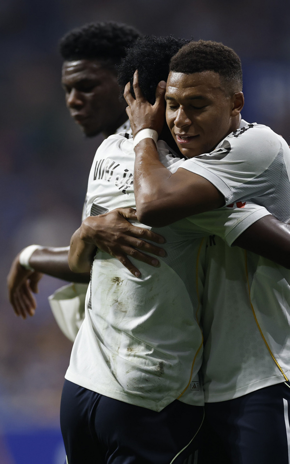 Vini Jr e Mbappé se abraçam em jogo do RealDivulgação / Real Madrid