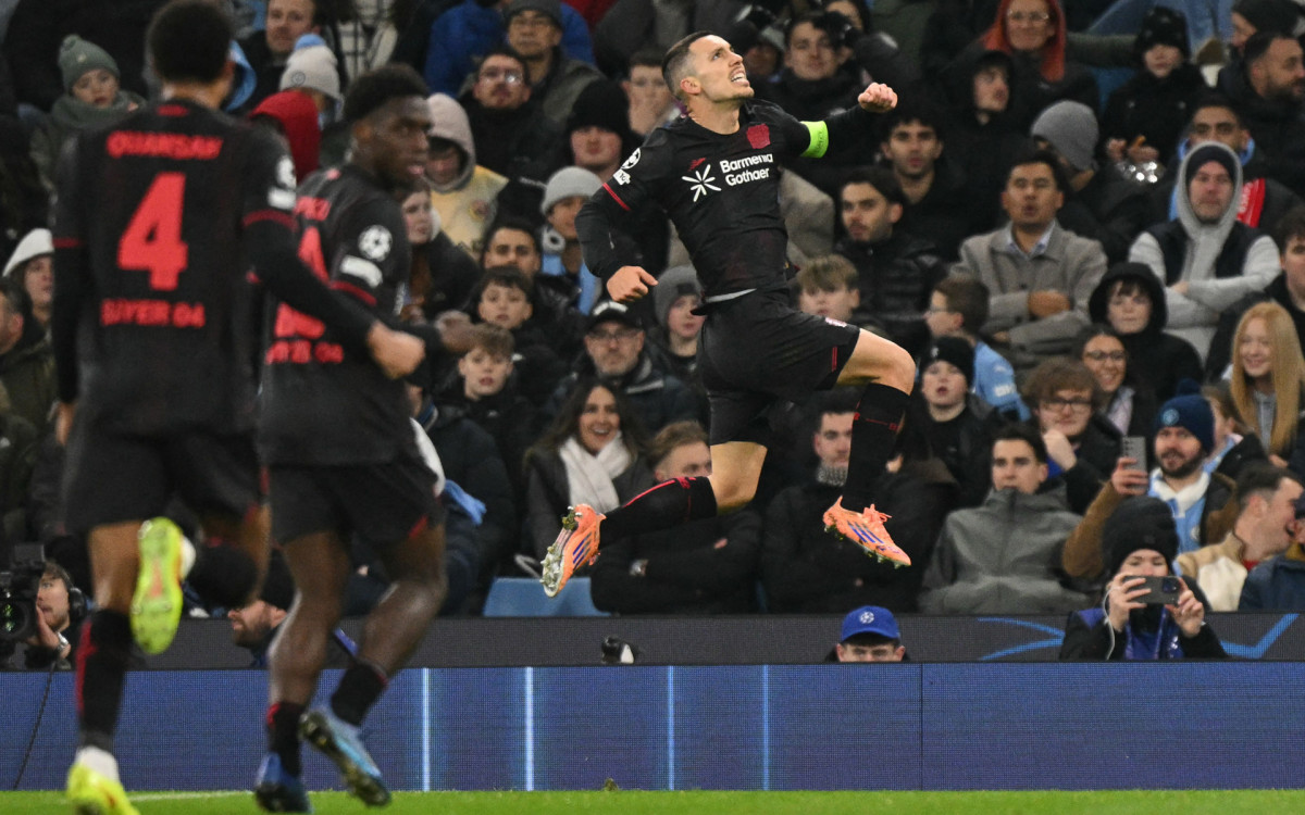 Grimaldo celebra gol marcado pelo Bayer Leverkusen sobre o Manchester City, no Etihad StadiumOli Scarff / AFP