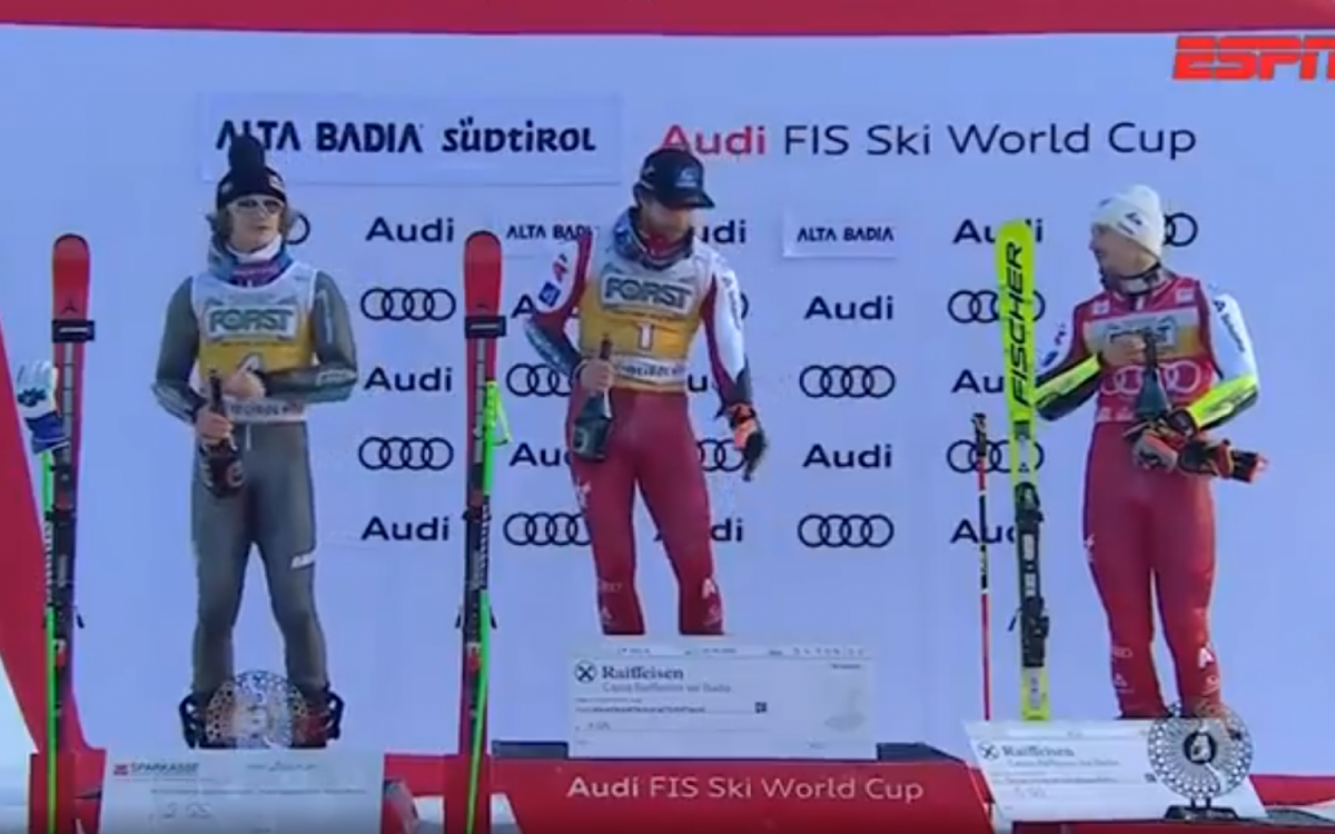 Lucas Pinheiro Braathen, de cinza, voltou a subir no pódio, agora na etapa de Alta Badia, na Itália,Reprodução de vídeo