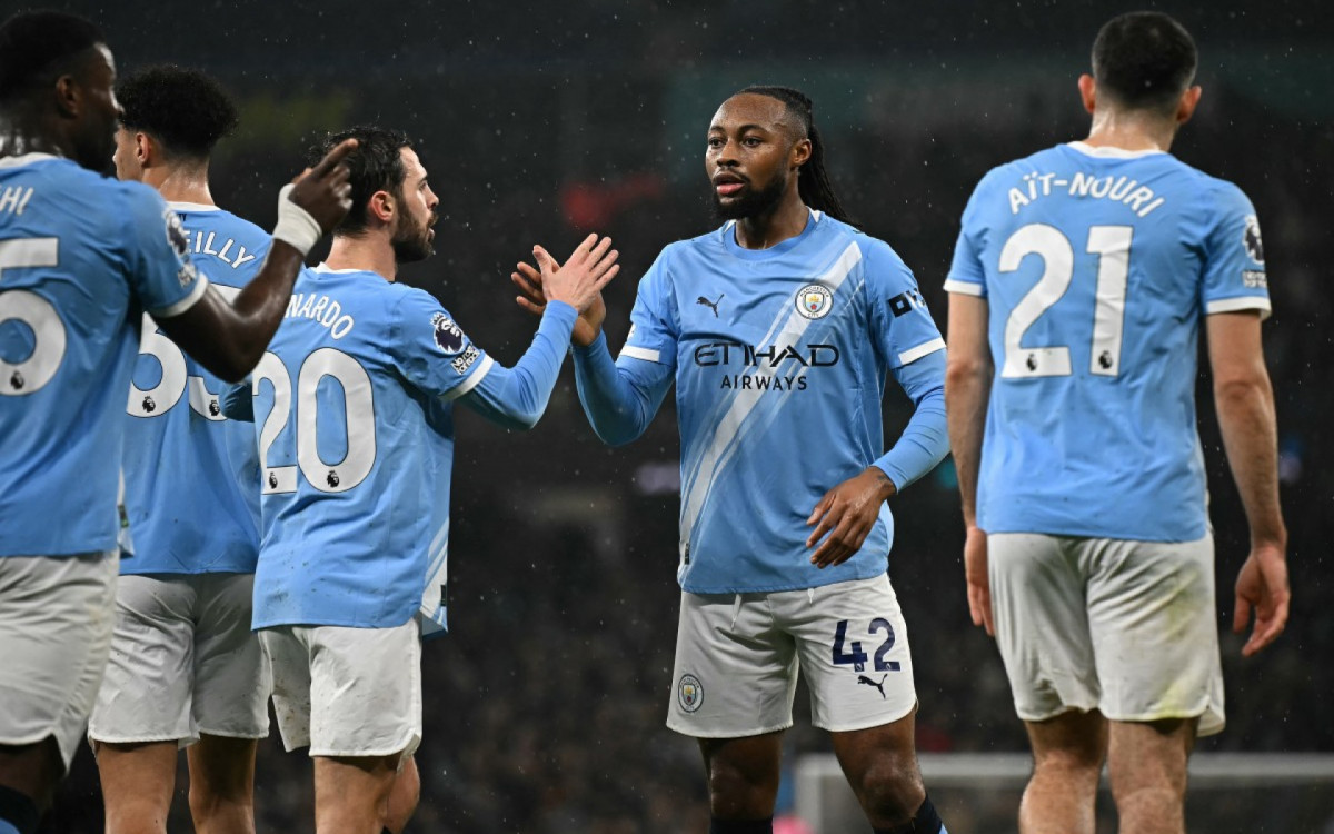 Antoine Semenyo (ao centro) abriu o placar na vitória do Manchester CityPaul Ellis / AFP