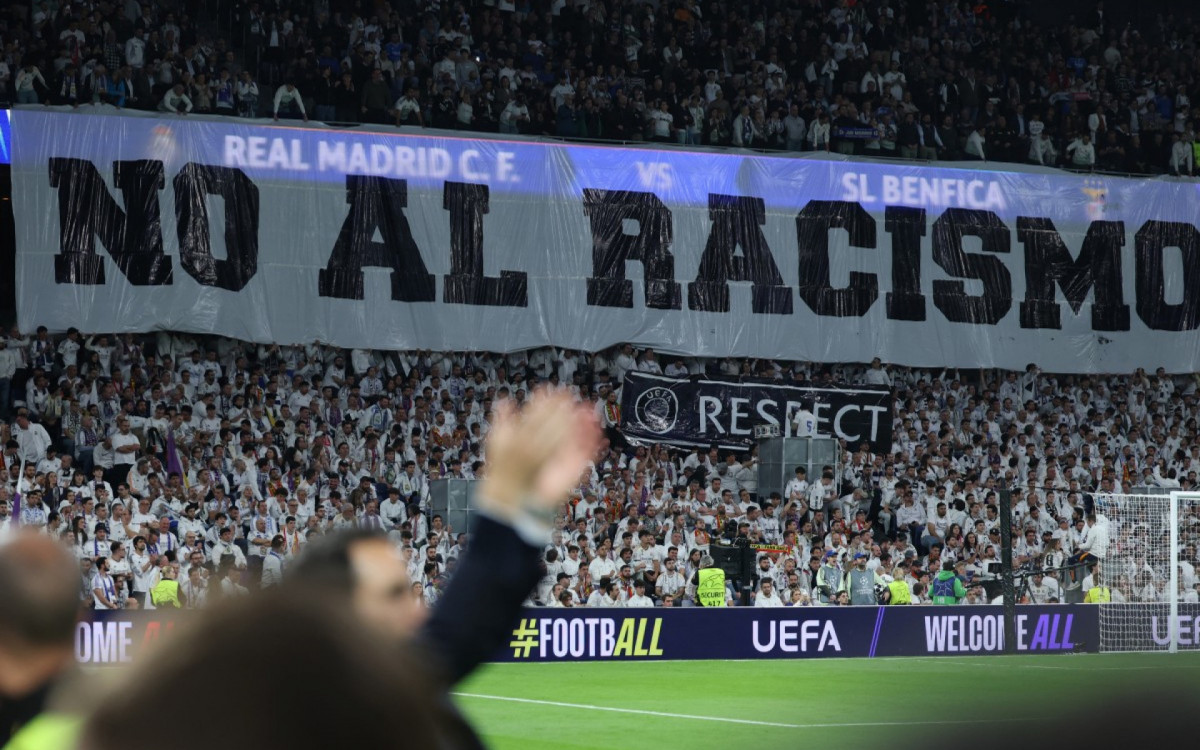 Espanha - As arquibancadas do Estádio Santiago Bernabéu foram palco de um protesto contra o preconceito nesta quarta-feira (25). Antes da bola rolar contra o Benfica, às 17h (de Brasília), a torcida do Real Madrid exibiu uma faixa com as mensagens "Não ao racismo" e "Respeito". A iniciativa é um apoio direto a Vini Jr, que denunciou ter sido alvo de ofensas racistas no jogo de ida, em Portugal.