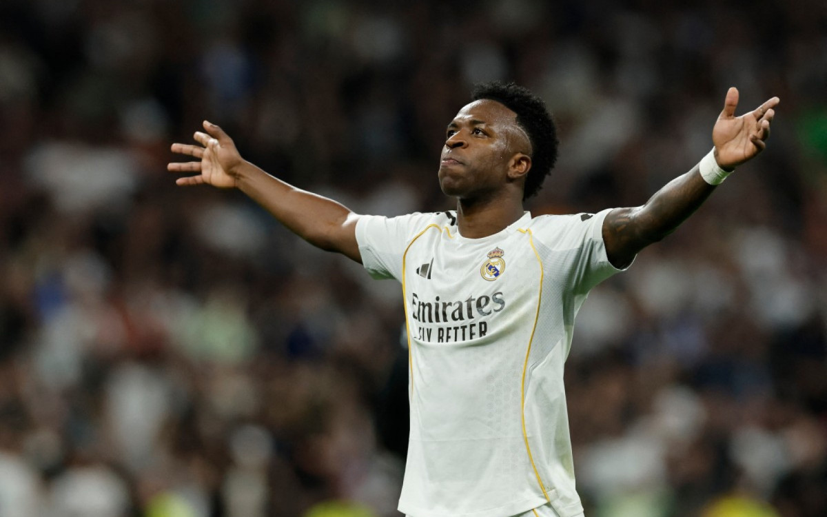 Comemoração de Vini Jr na vitória do Real Madrid sobre o Atlético de MadridOscar del Pozo / AFP