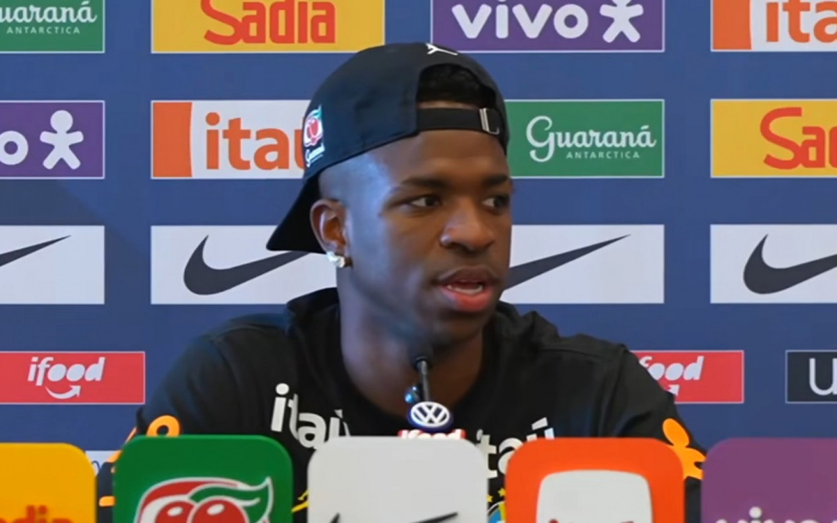 Vini Jr em coletiva de imprensa nesta quarta-feira (25)Reprodução / CBF