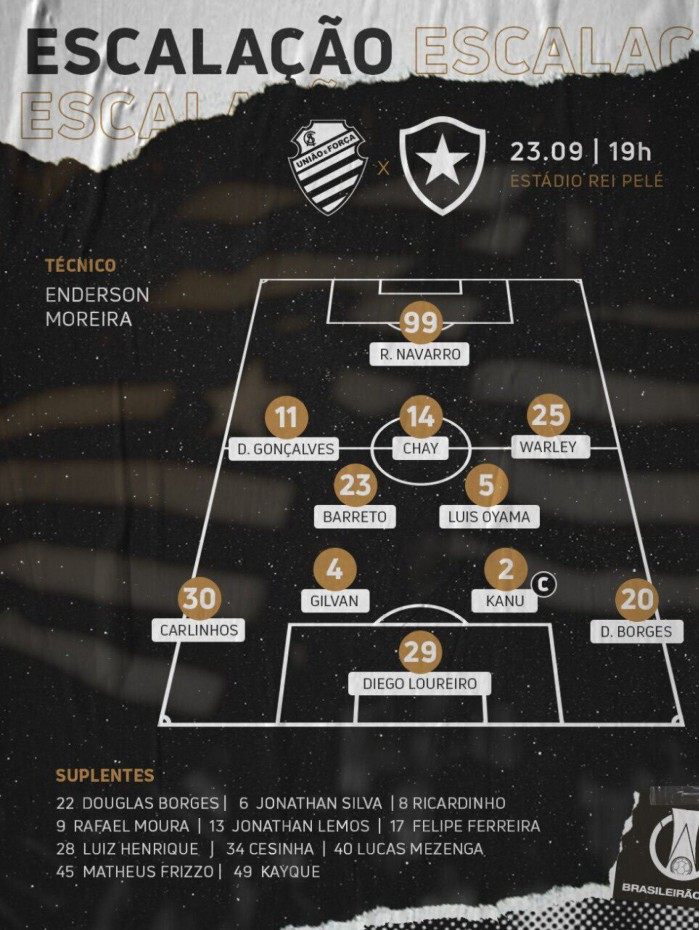 Escalação do Botafogo: Diego Loureiro; Daniel Borges, Kanu, Gilvan e Carlinhos; Barreto, Luís Oyama, Warley e Diego Gonçalves; Chay e Rafael Navarro.