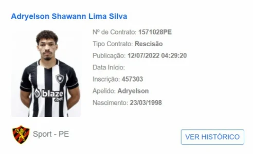 No entanto, o jogador ainda não está apto para estrear pelo seu novo clube. Isto porque, Adryelson não aparece no BID como jogador do Botafogo. A única mudança foi na sua foto, que antes era com a camisa do Sport, e agora passa a ser com o uniforme do Glorioso. Caso Luís Castro queira contar com o zagueiro no duelo com o Athletico-PR, neste sábado (23), a diretoria terá que correr para regularizar o defensor até às 18h de sexta (22).