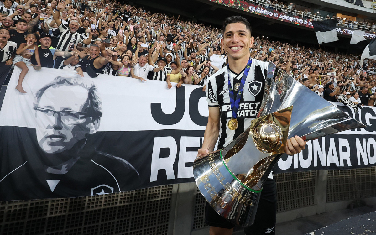 Savarino, do Botafogo, posa para foto com a troféu do BrasileirãoVítor Silva/Botafogo