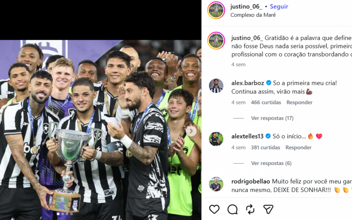"Vou fazer uma (tatuagem) minha com o Barboza. Eu já falei para ele, tem espaço", brincou Justino em entrevista ao 'Botafogo Podcast', programa da própria SAF.