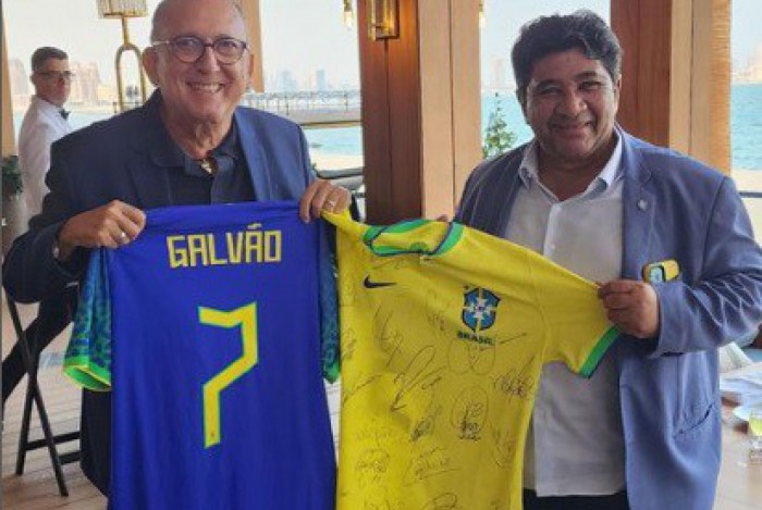 "Nesta quarta-feira (7), o presidente da CBF, Ednaldo Rodrigues, se encontrou com Galvão Bueno. Narrando sua 13ª edição de Copa do Mundo, o jornalista recebeu camisas autografadas da Seleção. Esperamos que a nossa sexta estrela venha sob a sua voz! Vamos juntos por mais esse sonho!", postou a CBF em suas redes sociais.
