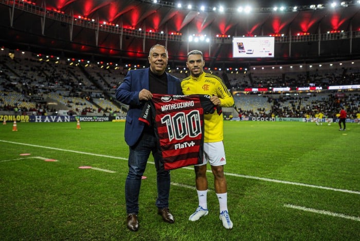 Titular nas últimas partidas do Flamengo, Matheuzinho teve mais uma motivo para comemorar além da vitória por 2 a 0 sobre o Cuiabá, pelo Brasileirão. O lateral de 21 anos recebeu uma camisa comemorativa pelas 100 partidas com a camisa rubro-negra, marca alcançada na derrota por 1 a 0 para o Bragantino, há duas rodadas.