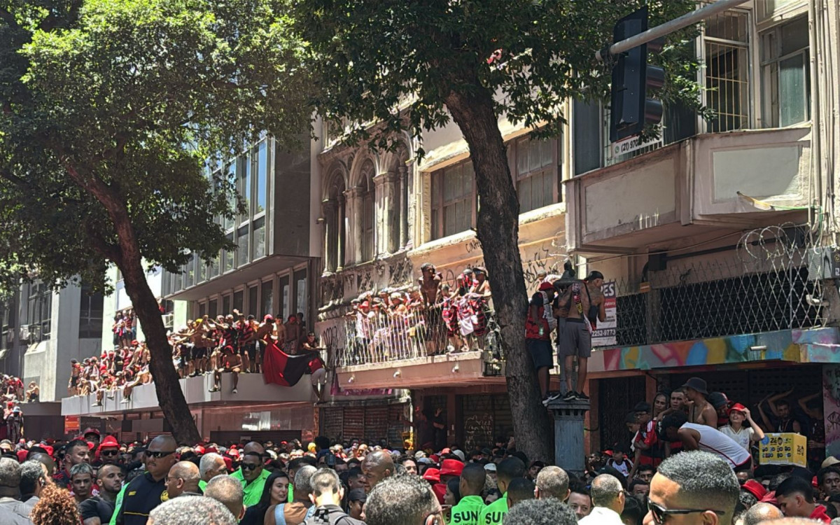 Há torcedores do Flamengo em cima de janelas, sinais de trânsito, placas e outras estruturas. As autoridades estimam um público de mais de 500 mil pessoas para comemorar o título da Libertadores no Centro do Rio.