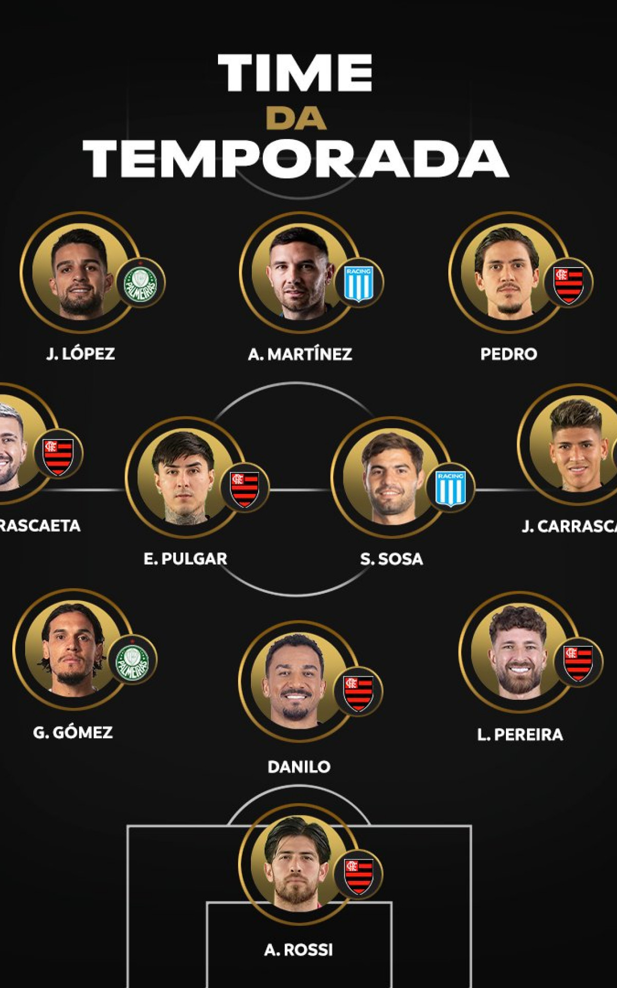 O goleiro Rossi, os zagueiros Danilo (autor do gol do título) e Léo Pereira, o volante Erick Pulgar, os meias Arrascaeta e Carrascal, além do atacante Pedro entraram na lista do time perfeito da competição.