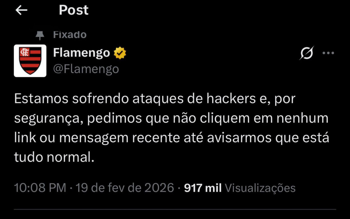 "Estamos sofrendo ataques de hackers e, por segurança, pedimos que não cliquem em nenhum link ou mensagem recente até avisarmos que está tudo normal", afirmou o clube, em publicação feita por volta das 22h10. Desde então, até a manhã desta sexta-feira (20), nenhuma nova postagem foi feita na conta.