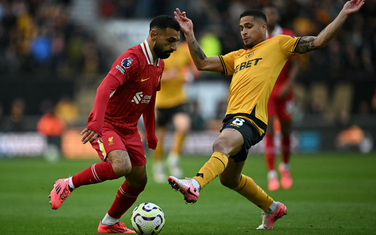 João Gomes, do Wolves, disputa bola com o egípcio Mohamed SalahPaul Ellis/AFP