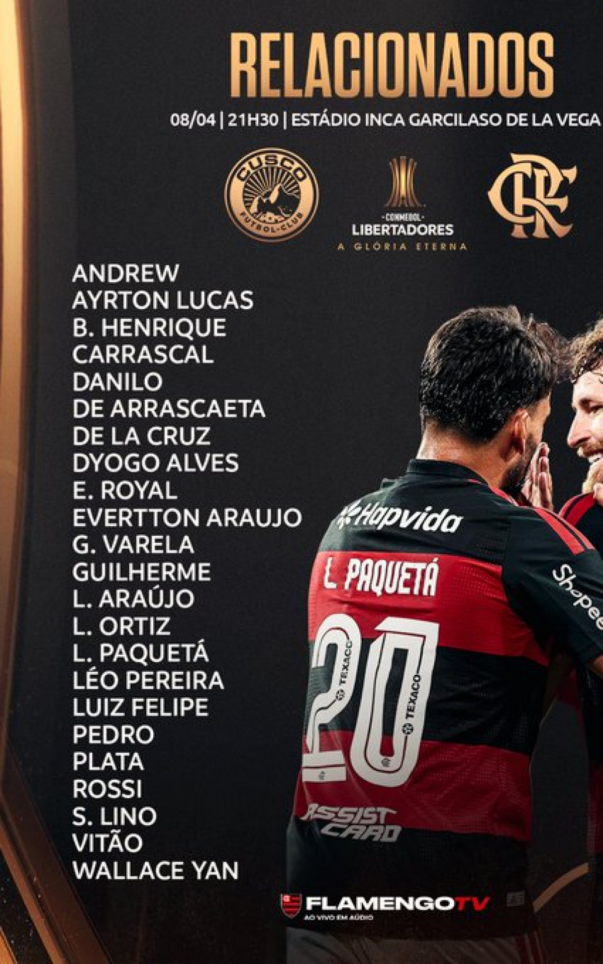 Rio - O Flamengo divulgou os relacionados para o jogo contra o Cusco, nesta quarta-feira (8). A bola rola às 21h30 (de Brasília), no Estádio Inca Garcilaso de la Vega, pela primeira rodada da fase de grupos da Libertadores. A lista tem as ausências de Jorginho e Erick Pulgar.