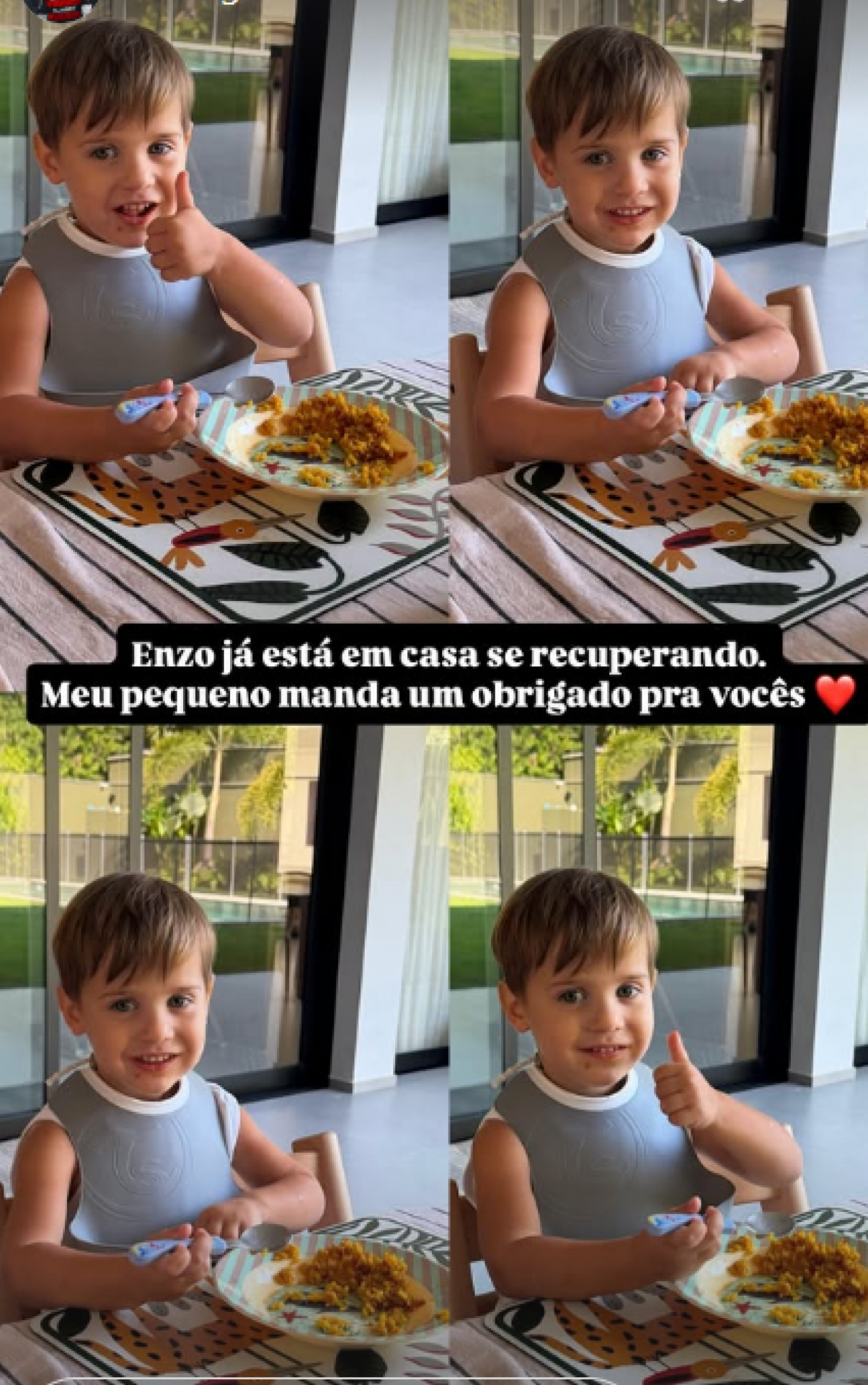 "Enzo já está em casa se recuperando. Meu pequeno manda um obrigado pra vocês" escreveu o espanhol.