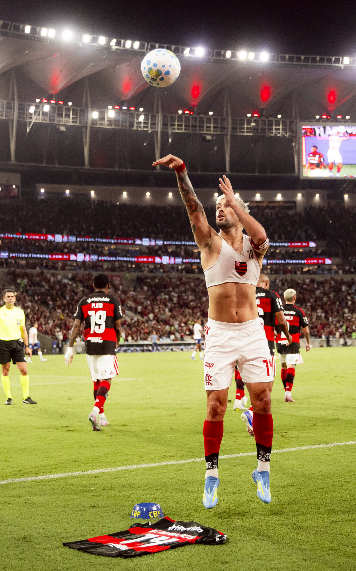 Arrascaeta usou a 14 em homenagem a Oscar Schmidt, lenda do basquete que morreu na sexta-feira (17). Na comemoração, ele tirou a camisa e exibiu o número para a torcida. Logo depois, pegou uma das bolas de jogo e fez um arremesso. Ele recebeu cartão amarelo por tirar a camisa.