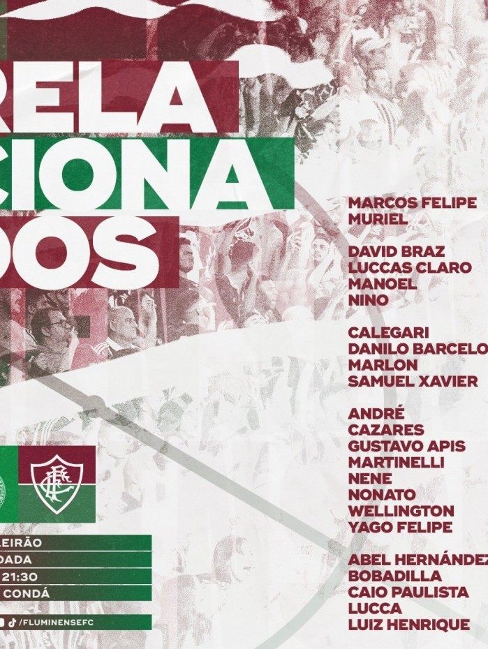 Rio - O Fluminense divulgou nesta terça-feira a lista de jogadores relacionados pelo treinador Marcão para a partida contra a Chapecoense, na Arena Condá, às 21h30. O jogo é válido pela 19ª rodada do Brasileirão 2021.