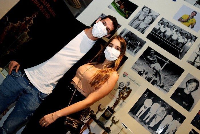Nino e a esposa Larissa Mota posam em frente ao mural de atletas com a foto do zagueiro na sala de troféus do FluminenseMailson Santana/Fluminense