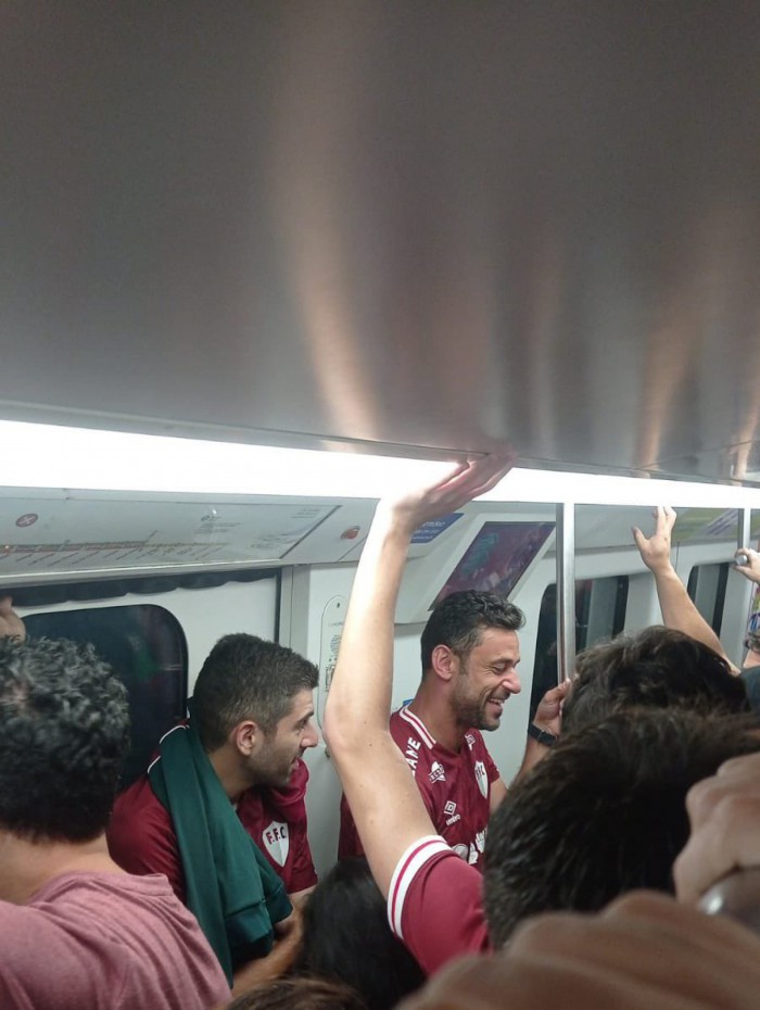 Rio - Um dos maiores ídolos do Fluminense, o atacante Fred foi ao Maracanã nesta quarta-feira (09) de um jeito diferente. O ex-atacante, que irá assistir ao duelo do Tricolor com o Goiás, resolveu ir ao estádio de metrô, junto de seu filho e de diversos torcedores do clube das Laranjeiras. O momento foi compartilhado pelo Flu em suas redes sociais. Confira: