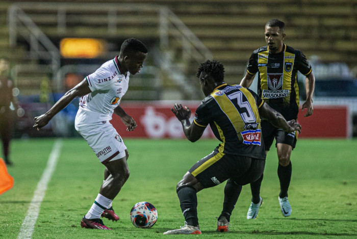 Jhon Arias, com a bola dominada na ponta direita, tenta passar pela marcação do Volta RedondaMARCELO GONÇALVES / FLUMINENSE