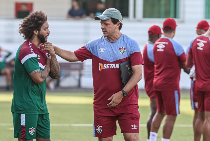 Marcelo conversa com o técnico Fernando Diniz durante o treino do Fluminense, no CT Carlos CastilhoMarcelo Gonçalves/Fluminense FC