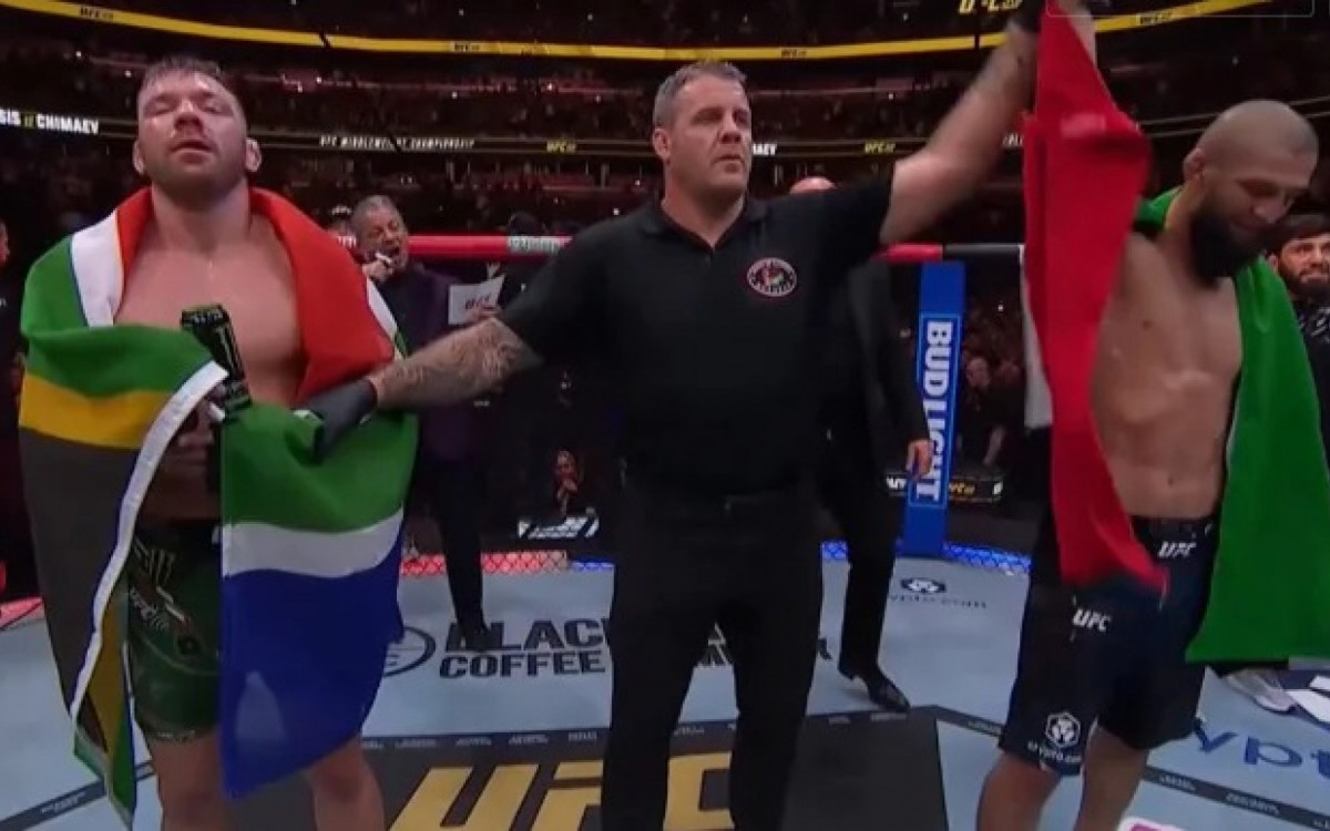Khamzat Chimaev precisou de poucos segundos para aplicar uma double leg e derrubar Dricus Du Plessis - que quase respondeu com triângulo de mão. Mas foi a única ação ofensiva do sul-africano. No chão, "Borz" chegou no crucifixo e ficou golpeando, sem tanta contundência, mas foi desgastando o adversário. O amplo domínio de Chimaev na luta principal do UFC 319 seguiu no segundo assalto, que grudou o "DDP" na grade e ficou aplicando joelhadas e outros golpes.