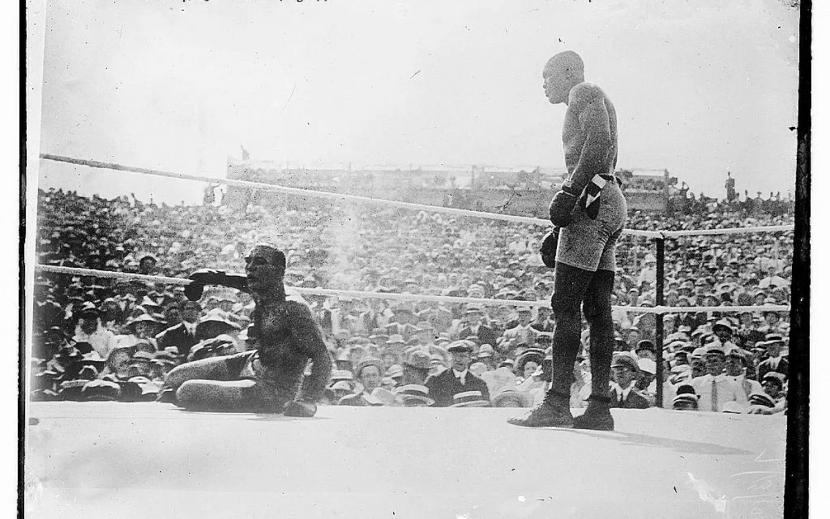 Apesar de representar o nascimento do cinema norte-americano, o filme da luta entre Johnson e Jeffries foi criminalizado e sistematicamente destruído a ponto de, hoje em dia, não existir mais um único registro da luta inteira (no vídeo acima, onde diz “full fight”, não é o filme completo: é tudo que sobrou dele). O próprio Johnson foi perseguido a ponto de ter sido acusado por um ato que, na época que ele cometeu, ainda não era considerado crime (transportar uma mulher branca, no caso a esposa dele, entre fronteiras estaduais). Johnson também é acusado de ter provocado o suicídio de uma de suas esposas, mas é sempre interessante imaginar quem é que causou a depressão na mulher branca que casou com ele, se foi o marido negro ou se foi a sociedade branca (a família dela, inclusive) que fez da vida dela um inferno.