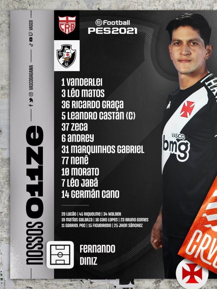 Escalação do Vasco: Vanderlei, Léo Matos, Ricardo Graça, Leandro Castan (C) e Zeca; Andrey, Nenê, Marquinhos Gabriel; Morato, Léo Jabá e Germán Cano.