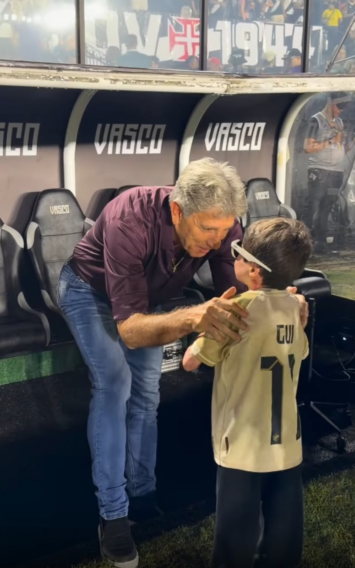 Em vídeo publicado nas redes sociais, o rapaz de 11 anos andou em direção ao treinador no banco de reservas e falou por alguns segundos com ele. "Seja muito bem-vindo, querido Renato Gaúcho", escreveu o jovem, na descrição da postagem.